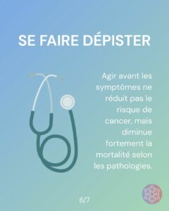 Ces actions n’offrent pas de garantie individuelle, mais elles permettent une réduction du risque de développer un cancer et, pour le dépistage, une diminution du risque de mortalité.